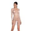 Вы легко можете создать раскованный и одновременно очаровательный образ, просто купите бодистокинг-платье с глубоким воротом Passion BS093 red. Максимально откровенное платье из крупной круглой сетки, с длинными рукавами и красивым воротом — это необычное сочетание минимализма и эротики.