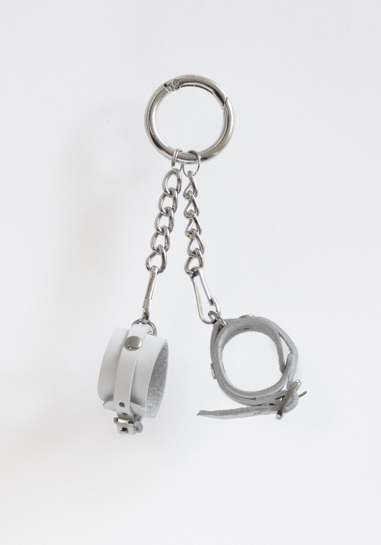Миниатюрная версия наручников изготовлена из натуральной кожи растительного дубления. Каждый наручник крепится к основному кольцу-карабину цепочкой и мини-карабином, поэтому можно носить только один наручник, а второй — подарить своему партнеру в качестве символа.