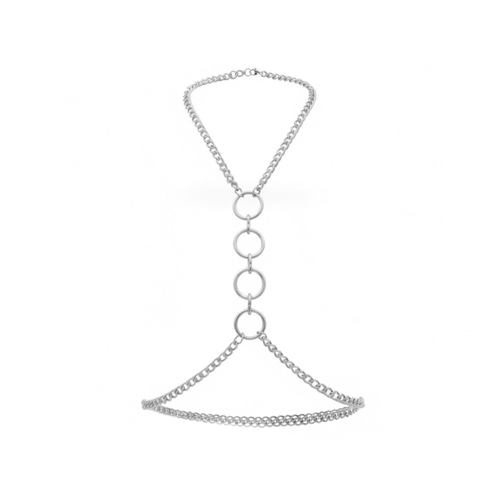 Конструкция мягко ложится по контуру, обрамляя зону декольте и подчеркивая талию. Центральные кольца усиливают драматичность образа и добавляют нотку доминирования. В движении цепи красиво перекликаются с телом, создавая игру света и притягательную динамику.