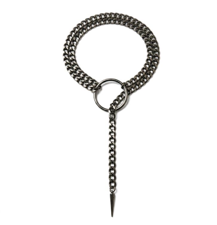 Эффектное украшение с массивной цепью и центральным кольцом создает сильный акцент и притягивает внимание с первого взгляда. Длинная подвеска визуально вытягивает силуэт и подчеркивает линию декольте.